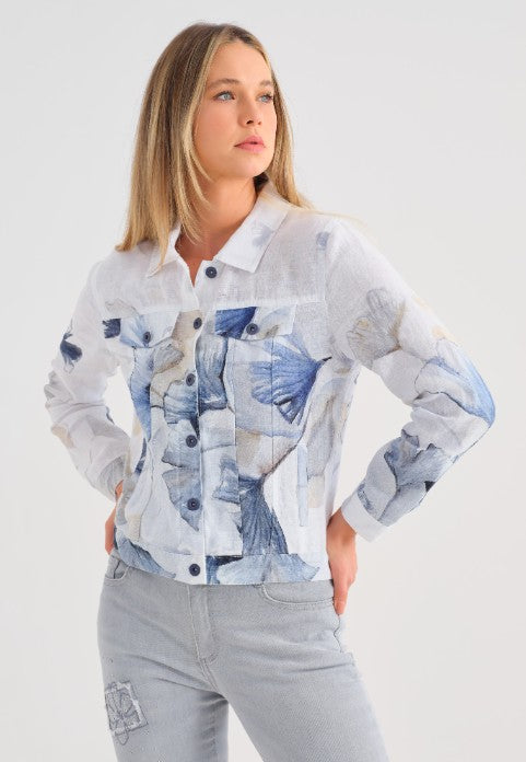 Elevate your wardrobe with this beautifully designed lightweight jacket, featuring an artistic watercolor floral print in calming shades of blue and beige. Crafted for both comfort and style, its tailored fit, classic collar, and button-down front create a timeless silhouette perfect for layering. Whether you're dressing up for a casual day out or adding a subtle statement piece to your look, this jacket offers effortless elegance and versatility.