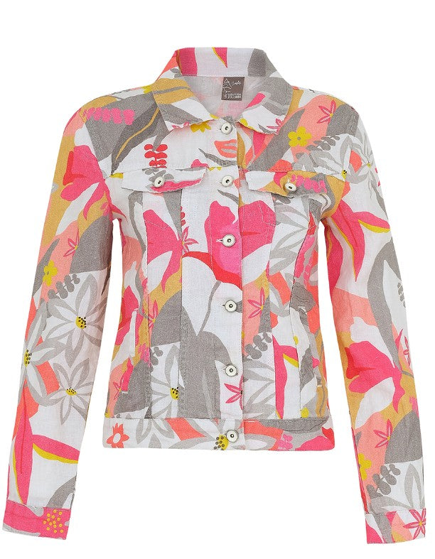 Add a vibrant twist to your outerwear with this floral-print button-up jacket, designed in soft, breathable fabric for effortless layering. Featuring a lively mix of coral, fuchsia, mustard, and taupe on a crisp white background, it blends structure with a splash of sunshine. Classic details like a shirt collar, front pockets, and buttoned cuffs meet artistic flair- perfect for pairing with neutrals or matching the coordinating dress for a head-turning ensemble.