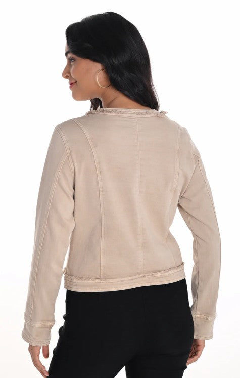 Make an entrance in this standout fringed jacket, where classic cool meets elevated detail. Designed to turn heads, this piece features bold silver buttons embossed with a crest emblem—adding a touch of royal flair to its edgy silhouette. Fringed accents bring movement and texture, while the cotton denim cut offers a flattering, feminine fit.