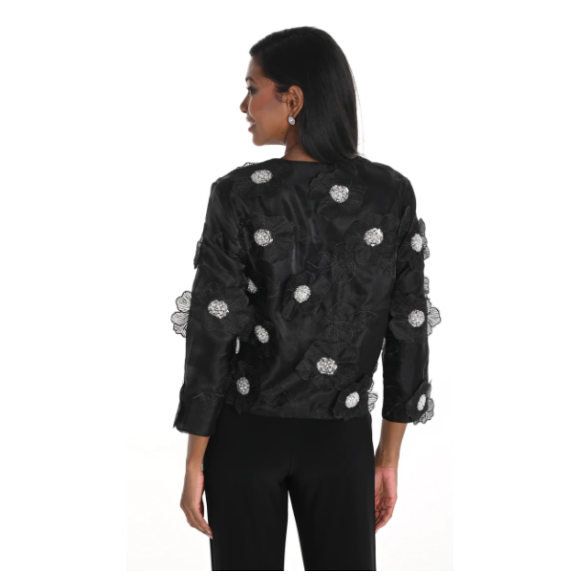 Refined and romantic, the Pula Jacket crafted with delicate floral appliqué detailing that adds texture and depth and timeless sophistication. This piece brings a touch of artistry to classic tailoring. The sleek black base makes it effortlessly versatile — perfect for elevating evening ensembles or adding a polished edge to everyday looks. Made in Canada - FL259727