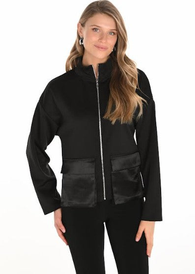 Step into timeless sophistication with this stunning black knit jacket from Frank Lyman. Crafted for the modern woman, this elegant piece features a sleek zipper front and soft, satin-like front pockets that add a luxurious touch to its structured silhouette. The tailored fit flatters every curve, while the rich knit fabric offers all-day comfort and effortless style. Whether you're dressing up for an evening out or elevating your everyday look, this jacket is the perfect blend of classic elegance and contemporary chic.