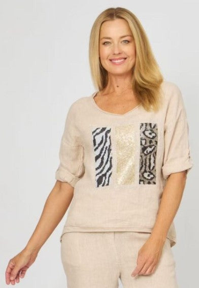 Add a dash of wild sparkle to your wardrobe with the Arizona Bling Patch Top. Made from soft, breathable linen in a natural tone, this relaxed-fit top features a trio of sequinned animal print panels for a bold yet effortless look. Rolled tab sleeves and a flattering scoop neckline complete the laid-back silhouette—perfect for dressing up your everyday with a hint of glam.