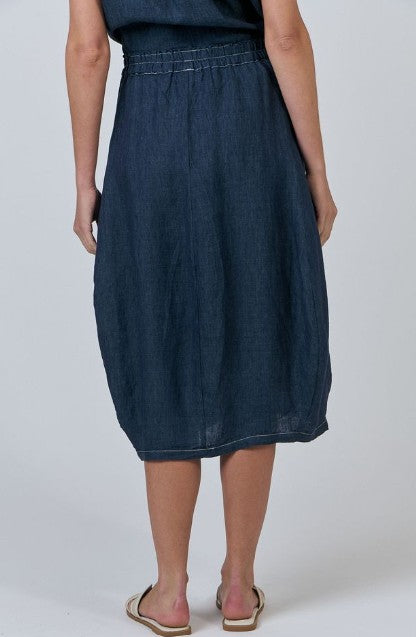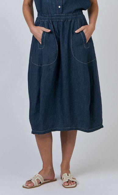 This midi-length denim skirt brings effortless charm to your everyday wardrobe. With its soft, flowy silhouette, elastic waistband, and oversized patch pockets, it's as practical as it is stylish. Pair it with a simple tank or blouse and your favourite sandals for a look that's relaxed, timeless, and ready for anything summer throws your way.