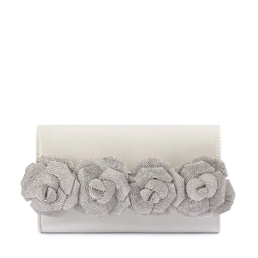 The STELLA Rosette Clutch features elegant rosette detailing, adding a romantic touch to any outfit. Perfect for special occasions, it offers the option to carry it by hand or use the removable shoulder chain for hands-free convenience. A chic and stylish choice for making a statement!
