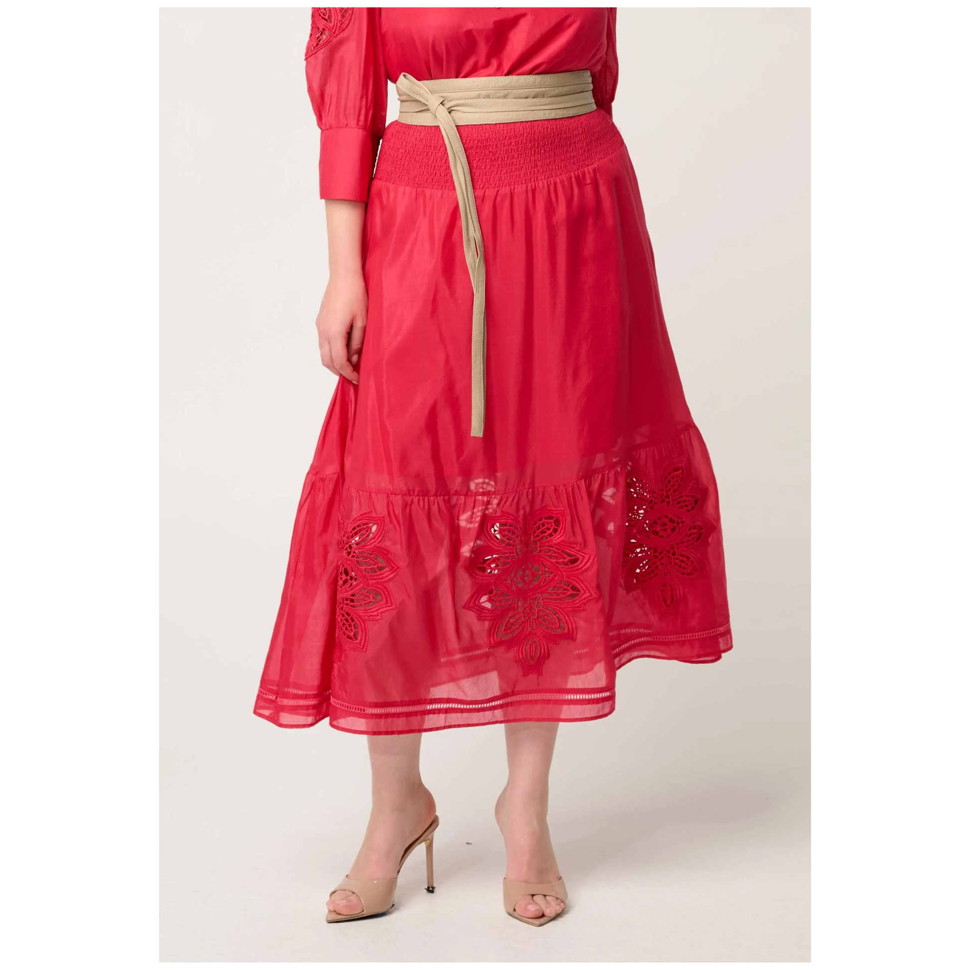 The Cordelia Shirred Waist Silk Cotton Skirt in Ruby is light, comfortable, and easy to wear. Made from a soft silk–cotton blend, it drapes beautifully and feels great for warm weather. The rich ruby colour stands out, and the embroidered hem adds a delicate touch. The shirred waistband gives a flexible, flattering fit.