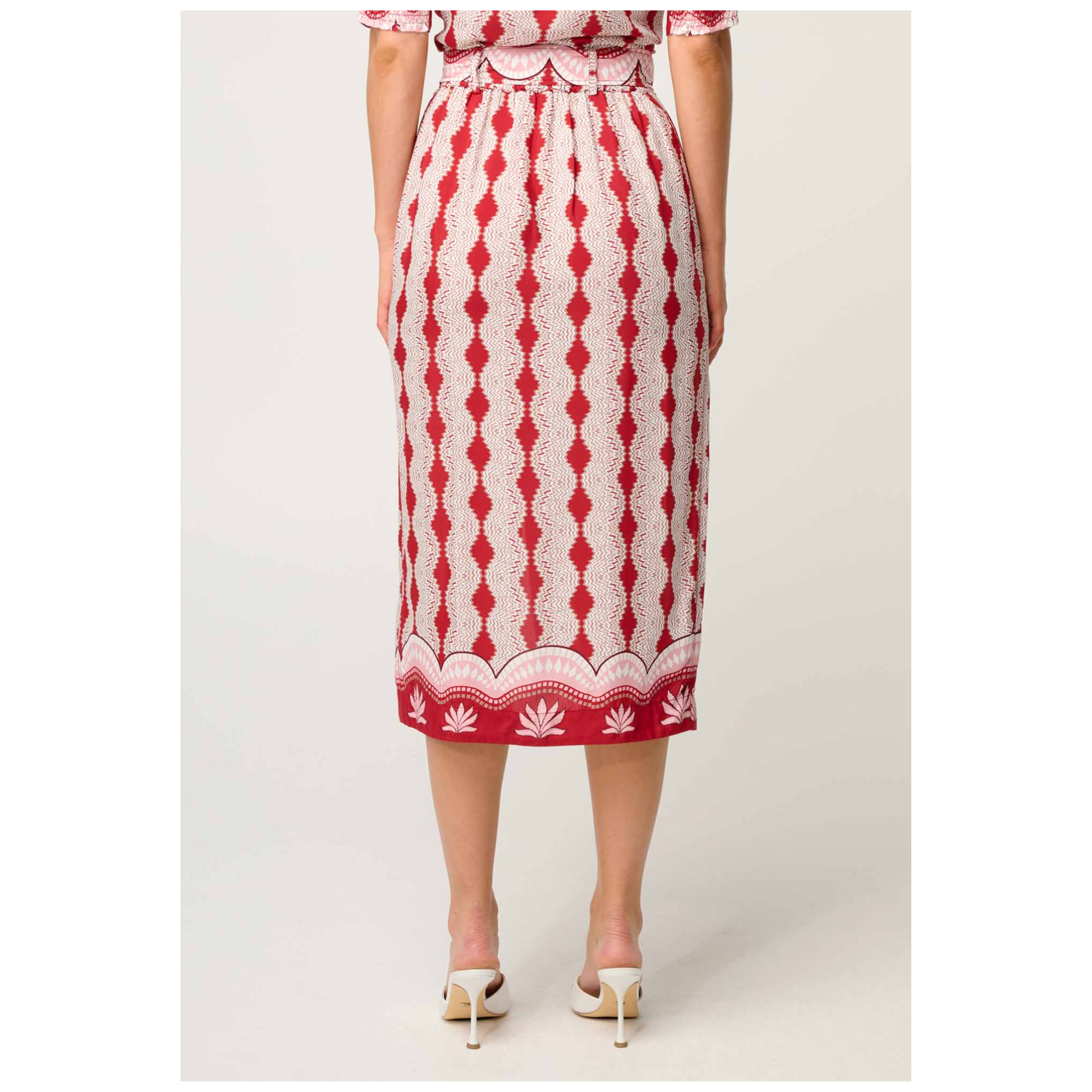 Elevate your wardrobe with the Nora Midi Skirt in Marrakech Ruby. Made from a soft viscose blend, it features intricate geometric and botanical embroidery in rich ruby and ivory tones. The high-rise waist and slim silhouette create a flattering, elegant shape, while the front split adds ease and a touch of allure. Falling below the knee, it’s a versatile piece that moves effortlessly from day to night.