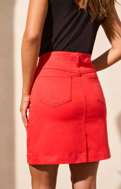This skort combines classic style with all-day comfort. Made from stretch denim with an easy pull-on waistband, it features a tummy-smoothing front panel, decorative fly with metal shank, and functional pockets.